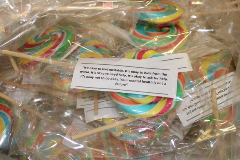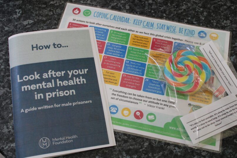 We gave each resident a copy of Action for Happiness’ Coping Calendar, which is focused on things you can do each day for 30 days to be kind to others or yourself. We also gave residents a guide to looking after your mental health in prison, which was written by other prisoners and gives tips on how to access support. Finally, to brighten their day, we gave each resident a swirly lollipop with positive quotes attached – which understandably went down very well with our lads!